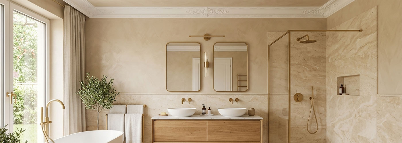 - Alle nicht gefliesten Bereiche erhalten hochwertige, geeignete Putze oder Anstriche.